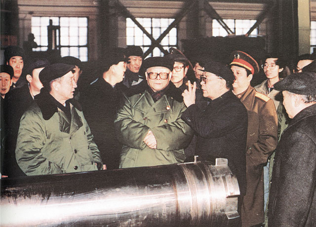 | 1990年2月17日中共中央總書(shū)記江澤民視察127廠時(shí)在車(chē)間聽(tīng)取匯報(bào) | ||