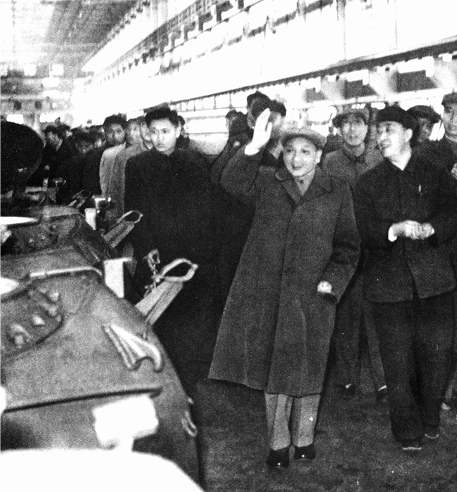 | 1964年4月8日中共中央總書記鄧小平視察617廠時(shí)在總裝車間向干部職工招手致意 | ||