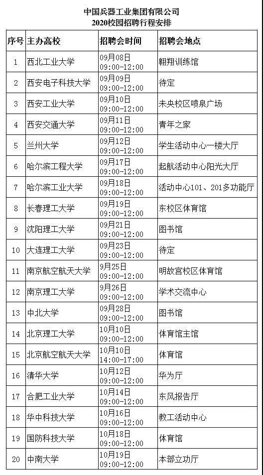中國兵器工業(yè)集團 2020校園招聘火熱來襲 只等你來哦 有夢想的青年,請往下面看 讓我們攜手強軍報國 公司簡介 我們是我軍機械化、信息化、智能化裝備發(fā)展的骨干 我們是全軍毀傷打擊的核心支撐 我們是現(xiàn)代化新型陸軍體系作戰(zhàn)能力科研制造的主體 我們是國家“一帶一路”建設和軍民融合發(fā)展的主力 我們就是 中國兵器工業(yè)集團 我們闊步邁進世界一流防務集團 資產(chǎn)總額3960億元 世界500強企業(yè)排名140 中國制造業(yè)企業(yè)排名第9 連續(xù)15年獲國資委經(jīng)營業(yè)績考核A級 招聘信息 面對2020年離開校園的你們,我們準備了 >>職位:1500余個 >>招聘人數(shù):3774人 >>專業(yè)涉及: 武器類 武器系統(tǒng)與發(fā)射工程,彈藥工程與爆炸技術,探測制導與控制技術等 機械類 機械設計制造及其自動化,車輛工程,工程力學,機械電子工程等 電子類 電氣工程及其自動化,電子信息工程,通信工程,儀器儀表工程等 材料類 金屬材料工程,材料成型及控制工程,高分子材料與工程,材料科學與工程等 計算機類 計算機科學與技術,計算機系統(tǒng)結構,計算機軟件與理論,網(wǎng)絡工程等 經(jīng)管類 財務管理,工商管理,行政管理,人力資源管理,會計學,審計學等 其他 環(huán)境與安全類,臨床醫(yī)學,語言類,建筑學,法學,采礦工程,化學類等 行程安排 中國兵器工業(yè)集團2020屆校園招聘會將在全國12個城市、20所高校舉辦,招聘會具體行程見下表: