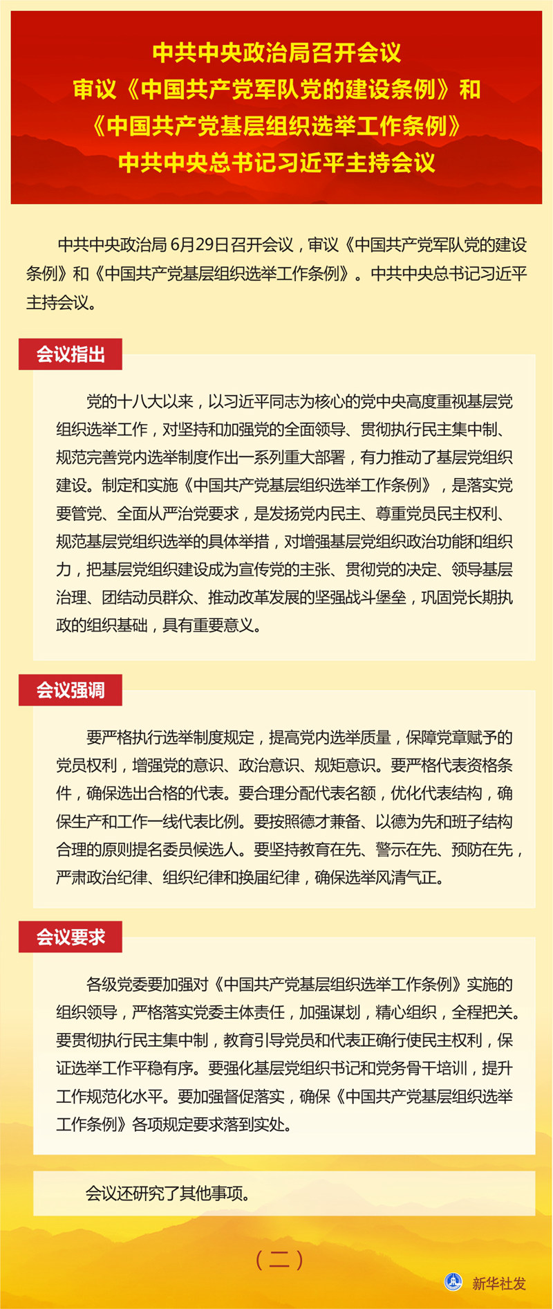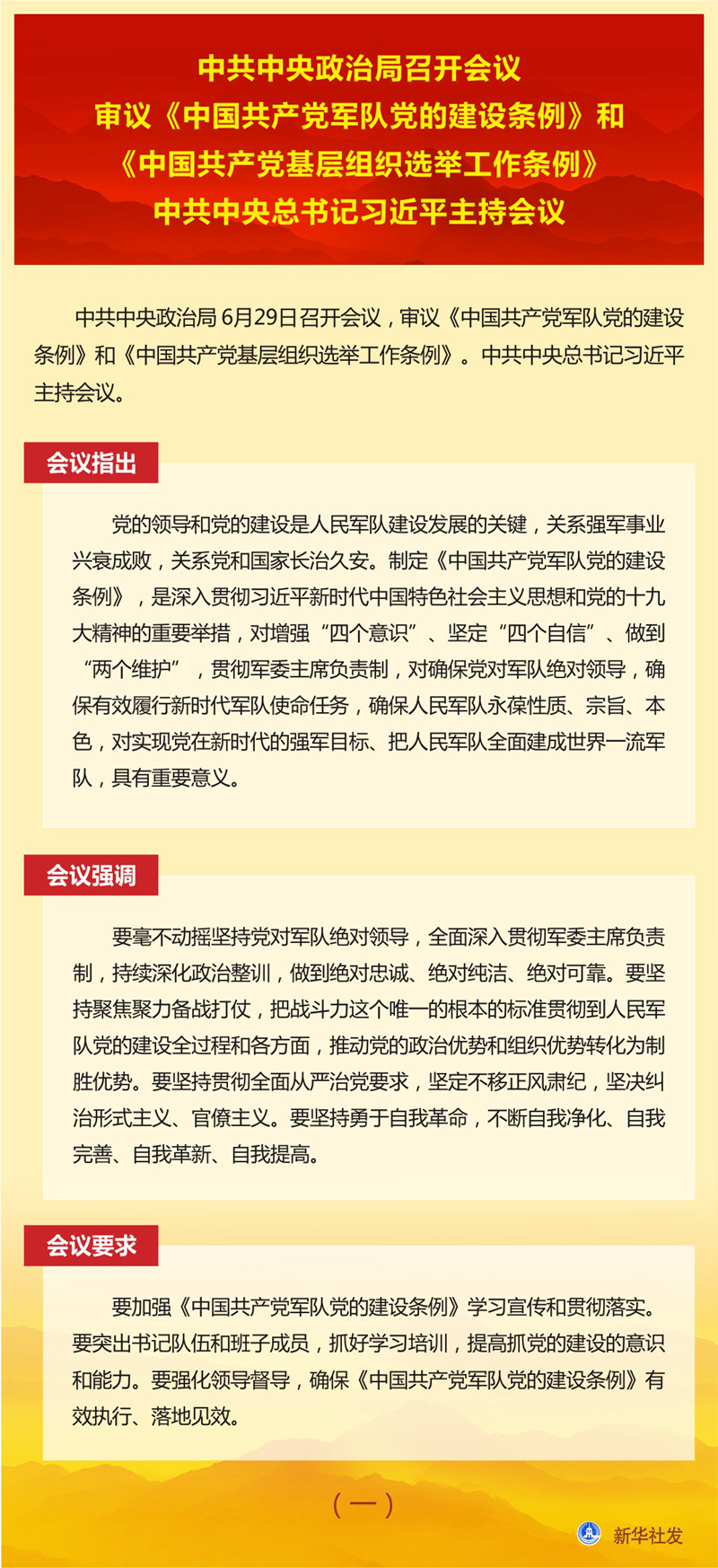 中共中央政治局召開會(huì)議 審議《中國共產(chǎn)黨軍隊(duì)黨的建設(shè)條例》和《中國共產(chǎn)黨基層組織選舉工作條例》 中共中央總書記習(xí)近平主持會(huì)議 新華社北京6月29日電 中共中央政治局6月29日召開會(huì)議,審議《中國共產(chǎn)黨軍隊(duì)黨的建設(shè)條例》和《中國共產(chǎn)黨基層組織選舉工作條例》。中共中央總書記習(xí)近平主持會(huì)議。 會(huì)議指出,黨的領(lǐng)導(dǎo)和黨的建設(shè)是人民軍隊(duì)建設(shè)發(fā)展的關(guān)鍵,關(guān)系強(qiáng)軍事業(yè)興衰成敗,關(guān)系黨和國家長治久安。制定《中國共產(chǎn)黨軍隊(duì)黨的建設(shè)條例》,是深入貫徹習(xí)近平新時(shí)代中國特色社會(huì)主義思想和黨的十九大精神的重要舉措,對(duì)增強(qiáng)“四個(gè)意識(shí)”、堅(jiān)定“四個(gè)自信”、做到“兩個(gè)維護(hù)”,貫徹軍委主席負(fù)責(zé)制,對(duì)確保黨對(duì)軍隊(duì)絕對(duì)領(lǐng)導(dǎo),確保有效履行新時(shí)代軍隊(duì)使命任務(wù),確保人民軍隊(duì)永葆性質(zhì)、宗旨、本色,對(duì)實(shí)現(xiàn)黨在新時(shí)代的強(qiáng)軍目標(biāo)、把人民軍隊(duì)全面建成世界一流軍隊(duì),具有重要意義。 會(huì)議強(qiáng)調(diào),要毫不動(dòng)搖堅(jiān)持黨對(duì)軍隊(duì)絕對(duì)領(lǐng)導(dǎo),全面深入貫徹軍委主席負(fù)責(zé)制,持續(xù)深化政治整訓(xùn),做到絕對(duì)忠誠、絕對(duì)純潔、絕對(duì)可靠。要堅(jiān)持聚焦聚力備戰(zhàn)打仗,把戰(zhàn)斗力這個(gè)唯一的根本的標(biāo)準(zhǔn)貫徹到人民軍隊(duì)黨的建設(shè)全過程和各方面,推動(dòng)黨的政治優(yōu)勢和組織優(yōu)勢轉(zhuǎn)化為制勝優(yōu)勢。要堅(jiān)持貫徹全面從嚴(yán)治黨要求,堅(jiān)定不移正風(fēng)肅紀(jì),堅(jiān)決糾治形式主義、官僚主義。要堅(jiān)持勇于自我革命,不斷自我凈化、自我完善、自我革新、自我提高。 會(huì)議要求,要加強(qiáng)《中國共產(chǎn)黨軍隊(duì)黨的建設(shè)條例》學(xué)習(xí)宣傳和貫徹落實(shí)。要突出書記隊(duì)伍和班子成員,抓好學(xué)習(xí)培訓(xùn),提高抓黨的建設(shè)的意識(shí)和能力。要強(qiáng)化領(lǐng)導(dǎo)督導(dǎo),確?!吨袊伯a(chǎn)黨軍隊(duì)黨的建設(shè)條例》有效執(zhí)行、落地見效。 會(huì)議指出,黨的十八大以來,以習(xí)近平同志為核心的黨中央高度重視基層黨組織選舉工作,對(duì)堅(jiān)持和加強(qiáng)黨的全面領(lǐng)導(dǎo)、貫徹執(zhí)行民主集中制、規(guī)范完善黨內(nèi)選舉制度作出一系列重大部署,有力推動(dòng)了基層黨組織建設(shè)。制定和實(shí)施《中國共產(chǎn)黨基層組織選舉工作條例》,是落實(shí)黨要管黨、全面從嚴(yán)治黨要求,是發(fā)揚(yáng)黨內(nèi)民主、尊重黨員民主權(quán)利、規(guī)范基層黨組織選舉的具體舉措,對(duì)增強(qiáng)基層黨組織政治功能和組織力,把基層黨組織建設(shè)成為宣傳黨的主張、貫徹黨的決定、領(lǐng)導(dǎo)基層治理、團(tuán)結(jié)動(dòng)員群眾、推動(dòng)改革發(fā)展的堅(jiān)強(qiáng)戰(zhàn)斗堡壘,鞏固黨長期執(zhí)政的組織基礎(chǔ),具有重要意義。 會(huì)議強(qiáng)調(diào),要嚴(yán)格執(zhí)行選舉制度規(guī)定,提高黨內(nèi)選舉質(zhì)量,保障黨章賦予的黨員權(quán)利,增強(qiáng)黨的意識(shí)、政治意識(shí)、規(guī)矩意識(shí)。要嚴(yán)格代表資格條件,確保選出合格的代表。要合理分配代表名額,優(yōu)化代表結(jié)構(gòu),確保生產(chǎn)和工作一線代表比例。要按照德才兼?zhèn)?、以德為先和班子結(jié)構(gòu)合理的原則提名委員候選人。要堅(jiān)持教育在先、警示在先、預(yù)防在先,嚴(yán)肅政治紀(jì)律、組織紀(jì)律和換屆紀(jì)律,確保選舉風(fēng)清氣正。 會(huì)議要求,各級(jí)黨委要加強(qiáng)對(duì)《中國共產(chǎn)黨基層組織選舉工作條例》實(shí)施的組織領(lǐng)導(dǎo),嚴(yán)格落實(shí)黨委主體責(zé)任,加強(qiáng)謀劃,精心組織,全程把關(guān)。要貫徹執(zhí)行民主集中制,教育引導(dǎo)黨員和代表正確行使民主權(quán)利,保證選舉工作平穩(wěn)有序。要強(qiáng)化基層黨組織書記和黨務(wù)骨干培訓(xùn),提升工作規(guī)范化水平。要加強(qiáng)督促落實(shí),確?!吨袊伯a(chǎn)黨基層組織選舉工作條例》各項(xiàng)規(guī)定要求落到實(shí)處。 會(huì)議還研究了其他事項(xiàng)。 |