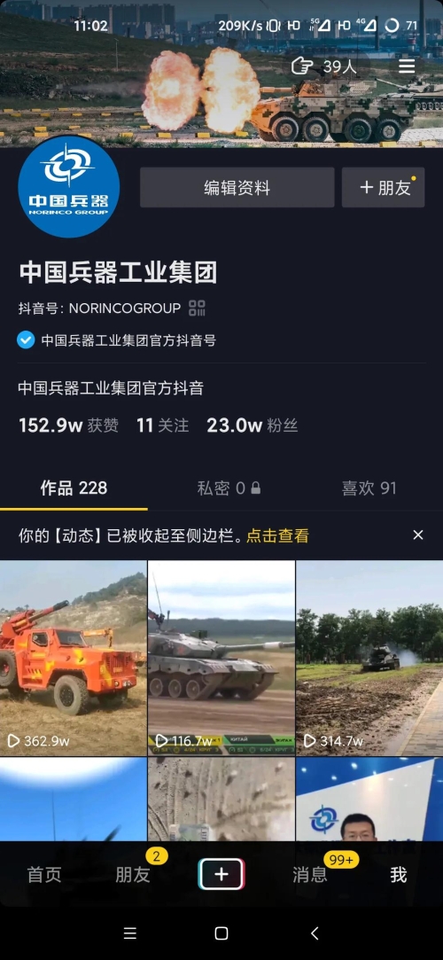 近日 中國(guó)兵器工業(yè)集團(tuán)抖音號(hào) 喜獲殊榮 成為2020年政務(wù)抖音號(hào) 優(yōu)秀創(chuàng)作者 2020年1月 集團(tuán)公司抖音號(hào)正式開(kāi)通 近1年來(lái),短視頻宣傳取得良好效果 截至目前,共發(fā)布視頻228個(gè) 總粉絲數(shù)23萬(wàn),獲贊152萬(wàn) 播放總量已超8000萬(wàn) |