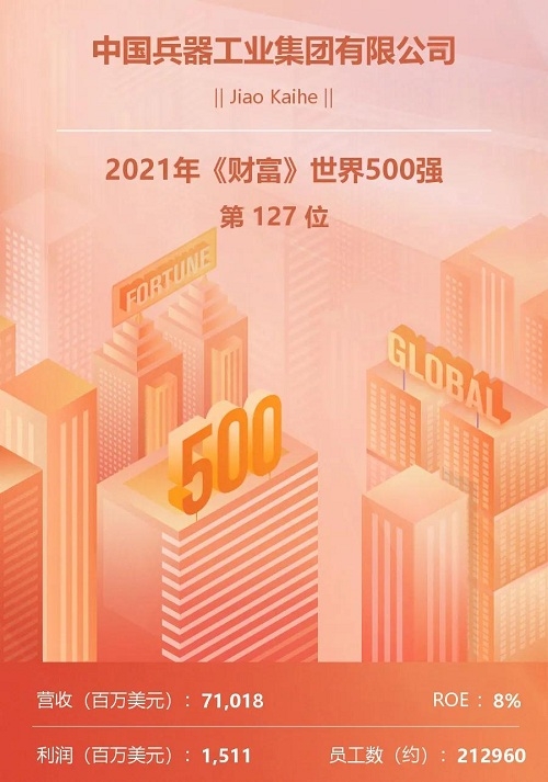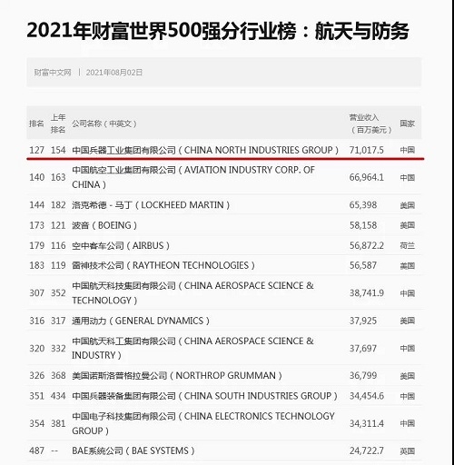 兵器工業(yè)集團(tuán)位列2021年世界500強(qiáng)第127位 |