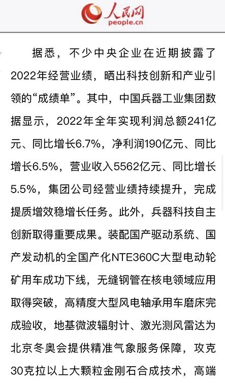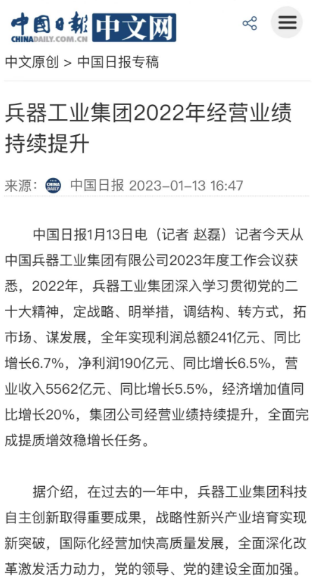 1月13日,中國(guó)兵器工業(yè)集團(tuán)有限公司召開(kāi)2023年度工作會(huì)議,傳達(dá)學(xué)習(xí)中央領(lǐng)導(dǎo)同志、軍方首長(zhǎng)和上級(jí)部門(mén)重要批示,總結(jié)集團(tuán)公司2022年工作,研究部署2023年主要工作任務(wù)。 集團(tuán)公司2022年重點(diǎn)工作取得的成績(jī)及下一步的改革發(fā)展受到社會(huì)媒體廣泛關(guān)注。新華社、新華財(cái)經(jīng)、人民網(wǎng)、經(jīng)濟(jì)日?qǐng)?bào)客戶端、光明日?qǐng)?bào)客戶端、中國(guó)日?qǐng)?bào)網(wǎng)、中國(guó)科技網(wǎng)、中國(guó)新聞網(wǎng)、央廣網(wǎng)、國(guó)資委網(wǎng)站、學(xué)習(xí)強(qiáng)國(guó)中央企業(yè)學(xué)習(xí)平臺(tái)、新浪網(wǎng)、騰訊網(wǎng)、搜狐網(wǎng)、網(wǎng)易網(wǎng)、今日頭條等中央主流媒體、國(guó)家部委網(wǎng)站及知名網(wǎng)絡(luò)媒體對(duì)集團(tuán)公司工作會(huì)議進(jìn)行了報(bào)道,重點(diǎn)關(guān)注集團(tuán)公司高質(zhì)量發(fā)展、科技創(chuàng)新、戰(zhàn)略性新興產(chǎn)業(yè)培育、深化改革、國(guó)際化經(jīng)營(yíng)、履行央企社會(huì)責(zé)任等內(nèi)容。其中新華社以《北斗時(shí)空智能服務(wù)平臺(tái)累計(jì)服務(wù)終端數(shù)突破15億》為題,重點(diǎn)報(bào)道了集團(tuán)公司2022年在自主創(chuàng)新、戰(zhàn)略新興產(chǎn)業(yè)培育、專利申請(qǐng)等方面取得的成績(jī);經(jīng)濟(jì)日?qǐng)?bào)客戶端、光明日?qǐng)?bào)客戶端、中國(guó)日?qǐng)?bào)網(wǎng)等以《兵器工業(yè)集團(tuán)2022年經(jīng)營(yíng)業(yè)績(jī)持續(xù)提升》為題,重點(diǎn)報(bào)道了集團(tuán)公司在高質(zhì)量發(fā)展、全面完成提質(zhì)增效穩(wěn)增長(zhǎng)方面取得的成績(jī)。集團(tuán)公司門(mén)戶網(wǎng)站、微信公眾號(hào)、微博等新媒體也對(duì)集團(tuán)公司工作會(huì)議進(jìn)行了及時(shí)報(bào)道,各成員單位紛紛對(duì)相關(guān)內(nèi)容進(jìn)行轉(zhuǎn)載,引發(fā)全系統(tǒng)關(guān)注。 新華社:北斗時(shí)空智能服務(wù)平臺(tái)累計(jì)服務(wù)終端數(shù)突破15億 新華財(cái)經(jīng):兵器工業(yè)集團(tuán)2022年實(shí)現(xiàn)凈利潤(rùn)190億元 同比增長(zhǎng)6.5% 人民網(wǎng):2022年中央企業(yè)營(yíng)收同比增長(zhǎng)8.3% 科技創(chuàng)新成效顯著 經(jīng)濟(jì)日?qǐng)?bào)客戶端:兵器工業(yè)集團(tuán)2022年經(jīng)營(yíng)業(yè)績(jī)持續(xù)提升 光明日?qǐng)?bào)客戶端:兵器工業(yè)集團(tuán)2022年經(jīng)營(yíng)業(yè)績(jī)持續(xù)提升 中國(guó)日?qǐng)?bào)網(wǎng):兵器工業(yè)集團(tuán)2022年經(jīng)營(yíng)業(yè)績(jī)持續(xù)提升 中國(guó)科技網(wǎng):兵器工業(yè)集團(tuán)2022年實(shí)現(xiàn)利潤(rùn)總額241億元 中國(guó)新聞網(wǎng):2022年兵器工業(yè)集團(tuán)實(shí)現(xiàn)利潤(rùn)總額241億元 同比增長(zhǎng)6.7% 國(guó)資委網(wǎng)站:2022年兵器工業(yè)集團(tuán)實(shí)現(xiàn)利潤(rùn)總額241億元 同比增長(zhǎng)6.7% 學(xué)習(xí)強(qiáng)國(guó)中央企業(yè)學(xué)習(xí)平臺(tái):兵器工業(yè)集團(tuán)2022年經(jīng)營(yíng)業(yè)績(jī)持續(xù)提升 集團(tuán)公司職工及廣大網(wǎng)友熱議工作會(huì)議 “這次會(huì)議全面總結(jié)了2022年工作,深入分析研判當(dāng)前形勢(shì),部署2023年重點(diǎn)工作,為我們做好2023年及今后一個(gè)時(shí)期的工作明確了目標(biāo)、堅(jiān)定了信心?!?/p> “作為兵工人,我要苦練內(nèi)功、不懼挑戰(zhàn)、奮勇向前,為建設(shè)具有全球競(jìng)爭(zhēng)力的世界一流集團(tuán)公司貢獻(xiàn)自己的力量?!?/p> “聚焦高科技領(lǐng)域,制造更多的大國(guó)重器,讓更多的產(chǎn)品服務(wù)老百姓?!?/p> “在不平凡的2022年取得了亮眼的工作成績(jī),為兵器工業(yè)點(diǎn)贊。” “希望能有更多新型武器裝備部隊(duì),2023年,望你們?cè)賱?chuàng)輝煌,加油!” |