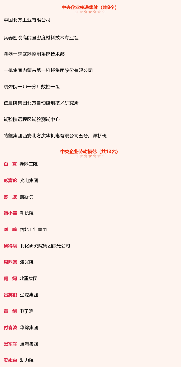 兵器工業(yè)集團8個集體和13名個人獲中央企業(yè)先進集體和勞動模范表彰 |